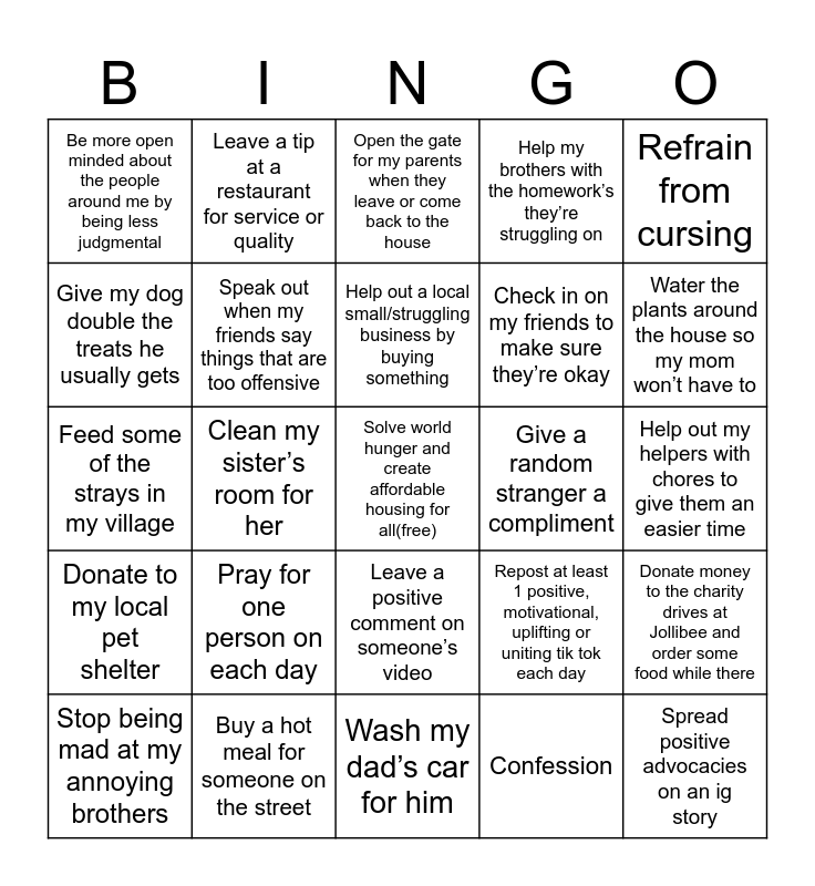 This bingo card has a free space and 24 words: Pray for one person on each day, Buy a hot meal for someone on the street, Help out a local small/struggling business by buying something, Stop being mad at my annoying brothers, Refrain from cursing, Be more open minded about the people around me by being less judgmental, Give my dog double the treats he usually gets, Leave a tip at a restaurant for service or quality, Give a random stranger a compliment, Leave a positive comment on someone’s video, Check in on my friends to make sure they’re okay, Feed some of the strays in my village, Repost at least 1 positive, motivational, uplifting or uniting tik tok each day, Donate money to the charity drives at Jollibee and order some food while there, Speak out when my friends say things that are too offensive, Confession, Help out my helpers with chores to give them an easier time, Open the gate for my parents when they leave or come back to the house, Water the plants around the house so my mom won’t have to, Clean my sister’s room for her, Spread positive advocacies on an ig story, Donate to my local pet shelter, Help my brothers with the homework’s they’re struggling on and Wash my dad’s car for him.