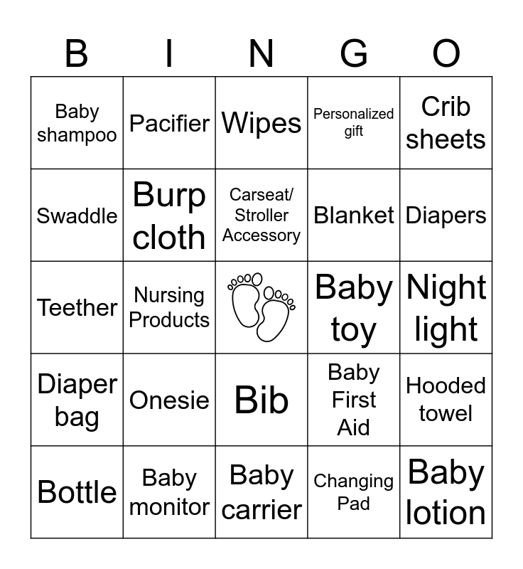 This bingo card has a free space and 29 words: Bottle, Socks, Nursing Products, Baby Book, Baby shampoo, Wipes, Burp cloth, Onesie, Baby toy, Baby monitor, Night light, Baby lotion, Baby carrier, Changing Pad, Diapers, Bottle Cleaner, Bib, Diaper bag, Crib sheets, Teether, Baby First Aid, Diaper cream, Blanket, Swaddle, Personalized gift, Pacifier, Hooded towel, Carseat/ Stroller Accessory and Hat.