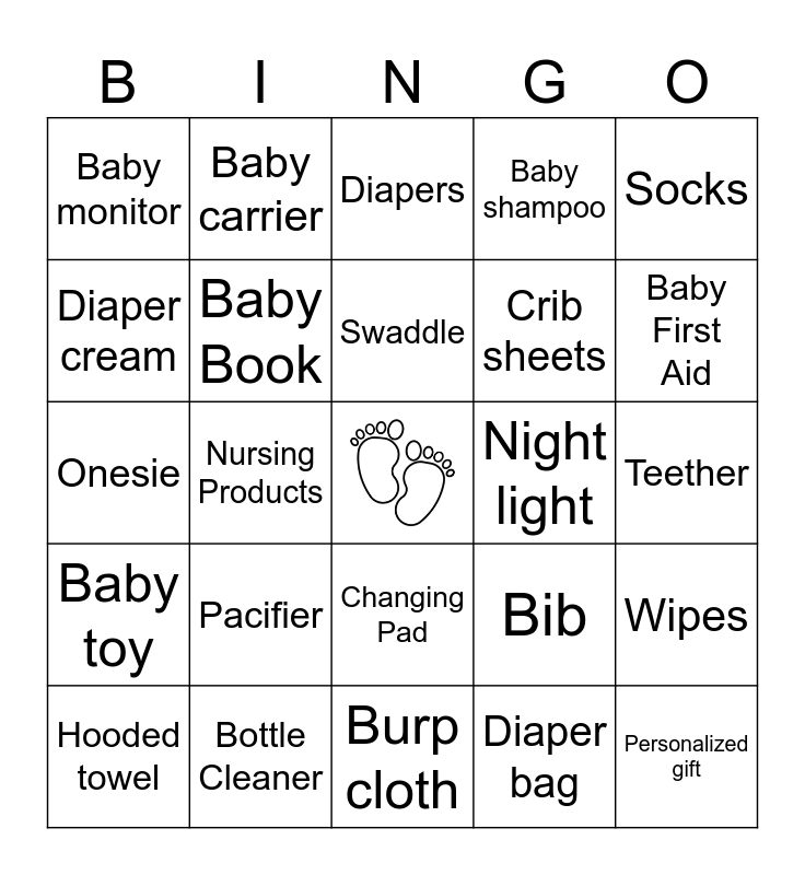 This bingo card has a free space and 29 words: Hooded towel, Bottle, Nursing Products, Carseat/ Stroller Accessory, Baby monitor, Diapers, Baby Book, Pacifier, Night light, Bottle Cleaner, Teether, Personalized gift, Burp cloth, Diaper bag, Baby First Aid, Blanket, Changing Pad, Baby toy, Socks, Onesie, Bib, Hat, Crib sheets, Diaper cream, Baby shampoo, Baby carrier, Wipes, Swaddle and Baby lotion.