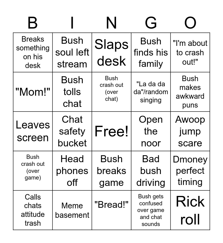 This bingo card has a free space and 24 words: Head phones off, Meme basement, Bush crash out (over chat), Calls chats attitude trash, "I'm about to crash out!", Breaks something on his desk, "Mom!", Bush soul left stream, Open the noor, Bush breaks game, "La da da da"/random singing, Leaves screen, Bad bush driving, Dmoney perfect timing, Bush tolls chat, Bush gets confused over game and chat sounds, Awoop jump scare, Slaps desk, Bush makes awkward puns, Chat safety bucket, Rick roll, Bush crash out (over game), Bush finds his family and "Bread!".