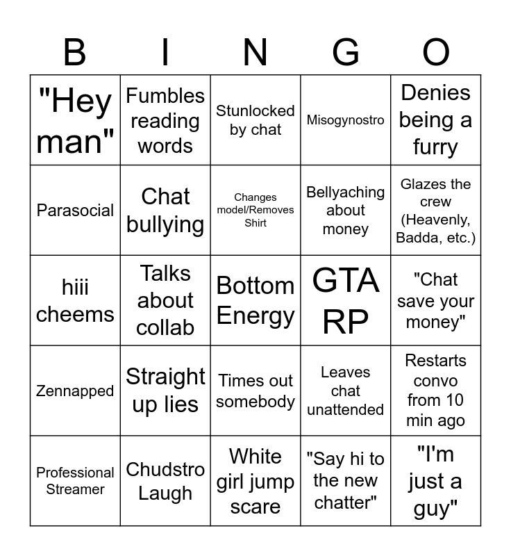 This bingo card has a free space and 35 words: Tummy hurt, Browsing twitter on stream, Crying for attention, Chat bullying, Times out somebody, Misogynostro, Parasocial, Performative, Changes model/Removes Shirt, Shut up and accept compliment, hiii cheems, Denies being a furry, Misreads chat, Rage Baited, "Hey man", GTA RP, "Say hi to the new chatter", Talks about collab, Zennapped, "I'm just a guy", Leaves chat unattended, Professional Streamer, Restarts convo from 10 min ago, Chudstro Laugh, Stunlocked by chat, Glazes the crew (Heavenly, Badda, etc.), Kicks his feet, Health and Fitness, Bellyaching about money, "Chat save your money", Virgin Innocence, White girl jump scare, Straight up lies, Fumbles reading words and "He just like me".