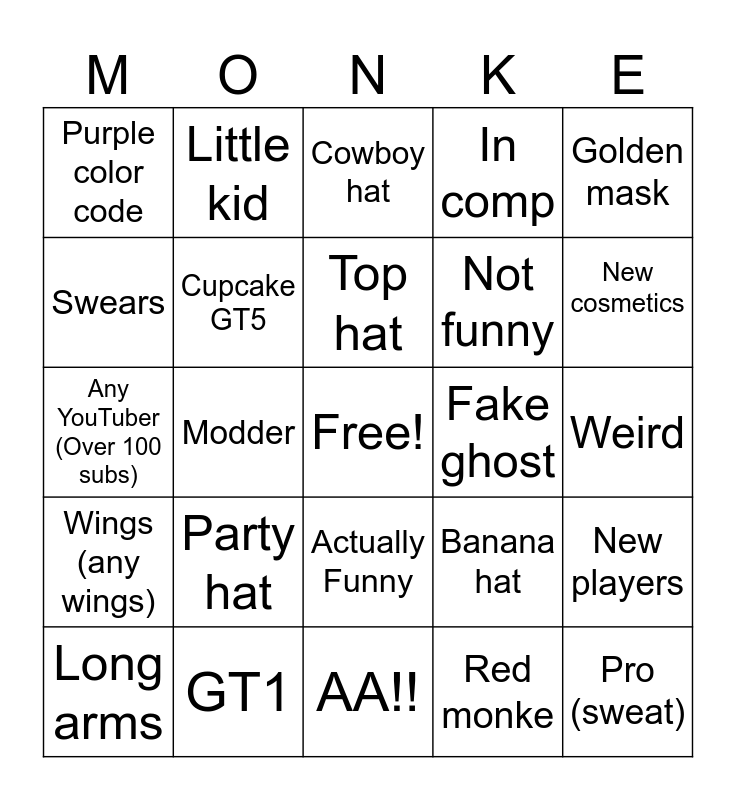 This bingo card has a free space and 24 words: Party hat, GT1, Top hat, Long arms, Golden mask, Purple color code, Swears, Little kid, Fake ghost, Actually Funny, Not funny, Any YouTuber (Over 100 subs), Banana hat, New players, Cupcake GT5, Red monke, Weird, Cowboy hat, New cosmetics, Modder, Pro (sweat), Wings (any wings), In comp and AA!!.