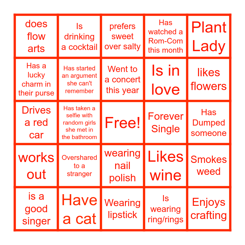 This bingo card has a free space and 29 words: is a good singer, Has had a one night stand, Has taken a selfie with random girls she met in the bathroom, Taken their shoes off in the club, does flow arts, prefers sweet over salty, Has started an argument she can't remember, Overshared to a stranger, Forever Single, Have a cat, Has Dumped someone, Enjoys crafting, Wearing lipstick, Is wearing ring/rings, likes flowers, Has a February birthday, wearing nail polish, works out, Plant Lady, Drives a red car, Likes wine, drinks coffee or tea, Is in love, Has a lucky charm in their purse, Has watched a Rom-Com this month, Is drinking a cocktail, Smokes weed, Went to a concert this year and has curly hair.