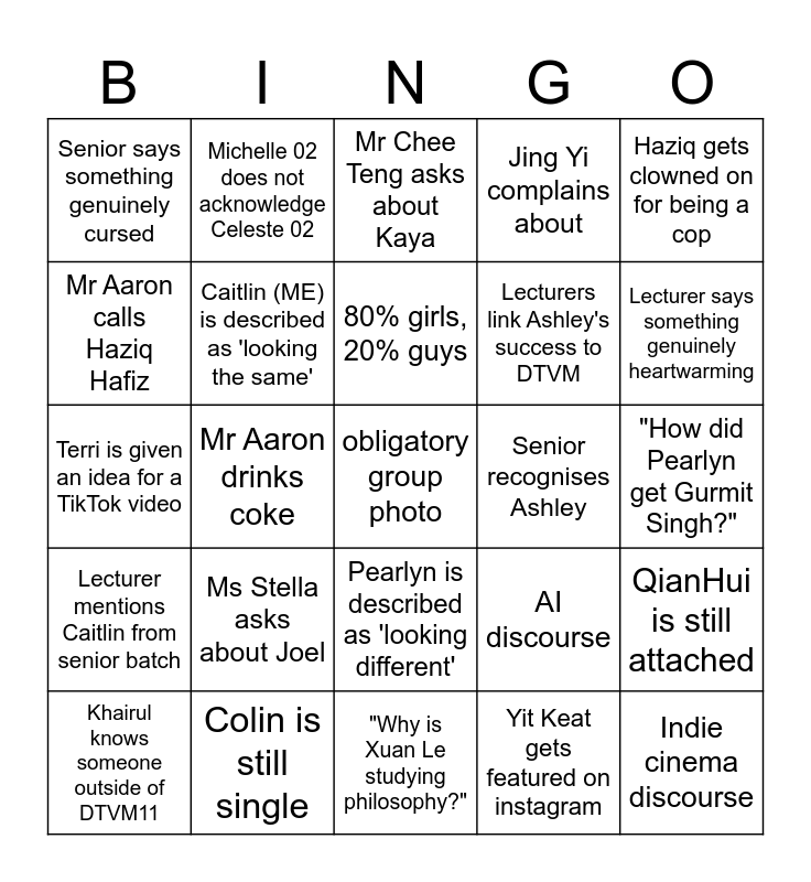 This bingo card has a free space and 24 words: Ms Stella asks about Joel, Colin is still single, 80% girls, 20% guys, Khairul knows someone outside of DTVM11, Haziq gets clowned on for being a cop, Senior says something genuinely cursed, Mr Aaron calls Haziq Hafiz, Michelle 02 does not acknowledge Celeste 02, Senior recognises Ashley, Pearlyn is described as 'looking different', Lecturers link Ashley's success to DTVM, Terri is given an idea for a TikTok video, AI discourse, QianHui is still attached, Caitlin (ME) is described as 'looking the same', Yit Keat gets featured on instagram, "How did Pearlyn get Gurmit Singh?", Mr Chee Teng asks about Kaya, Lecturer says something genuinely heartwarming, Mr Aaron drinks coke, Indie cinema discourse, Lecturer mentions Caitlin from senior batch, Jing Yi complains about and "Why is Xuan Le studying philosophy?".