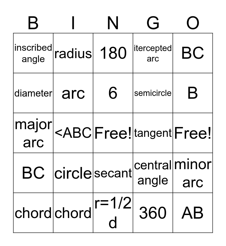 This bingo card has a free space and 24 words: circle, chord, 6, chord, BC, inscribed angle, diameter, radius, tangent, secant, semicircle, major arc, central angle, minor arc, arc, 360, Free!, 180, B, <ABC, AB, BC, itercepted arc and r=1/2 d.
