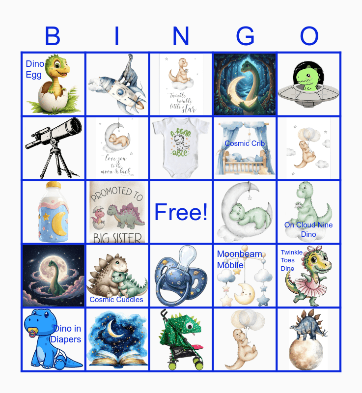 This bingo card has 24 images, a free space and 7 words: Cosmic Cuddles, Dino in Diapers, Dino Egg, Cosmic Crib, Moonbeam Mobile, Twinkle Toes Dino and On Cloud Nine Dino.