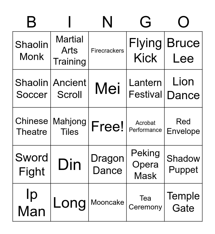 This bingo card has a free space and 24 words: Din, Long, Mei, Ip Man, Bruce Lee, Shaolin Monk, Shaolin Soccer, Martial Arts Training, Acrobat Performance, Dragon Dance, Lantern Festival, Chinese Theatre, Peking Opera Mask, Shadow Puppet, Ancient Scroll, Tea Ceremony, Red Envelope, Firecrackers, Lion Dance, Mahjong Tiles, Temple Gate, Sword Fight, Flying Kick and Mooncake.