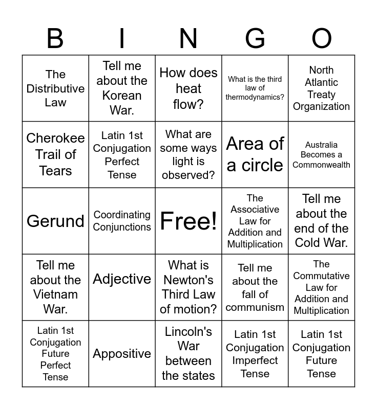 This bingo card has a free space and 36 words: Age of information and globalization, The circumference of a Circle, Conjunction, Latin 1st Conjugation Perfect Tense, Tell me about the fall of communism, Tell me about the Vietnam War., What are some ways light is observed?, Tell me about the Gulf War., North Atlantic Treaty Organization, What is the second law of thermodynamics?, Coordinating Conjunctions, What is the third law of thermodynamics?, 1st Conjugation Endings Pluperfect Tense, The Associative Law for Addition and Multiplication, Australia Becomes a Commonwealth, The Distributive Law, World War 2 and President Franklin D. Roosevelt, Adjective, Latin 1st Conjugation Future Tense, How does heat flow?, Tell me about the end of the Cold War., The Commutative Law for Addition and Multiplication, Appositive, Latin 1st Conjugation Future Perfect Tense, Lincoln's War between the states, Tell me about the Korean War., Gerund, What is the first law of thermodynamics?, Area of a circle, Cherokee Trail of Tears, Tell me about the United Nations., 5 Cases of Nouns, Latin 1st Conjugation Imperfect Tense, What is Newton's Third Law of motion?, Area of a Triangle and Latin 1st Conjugation Perfect Tense.