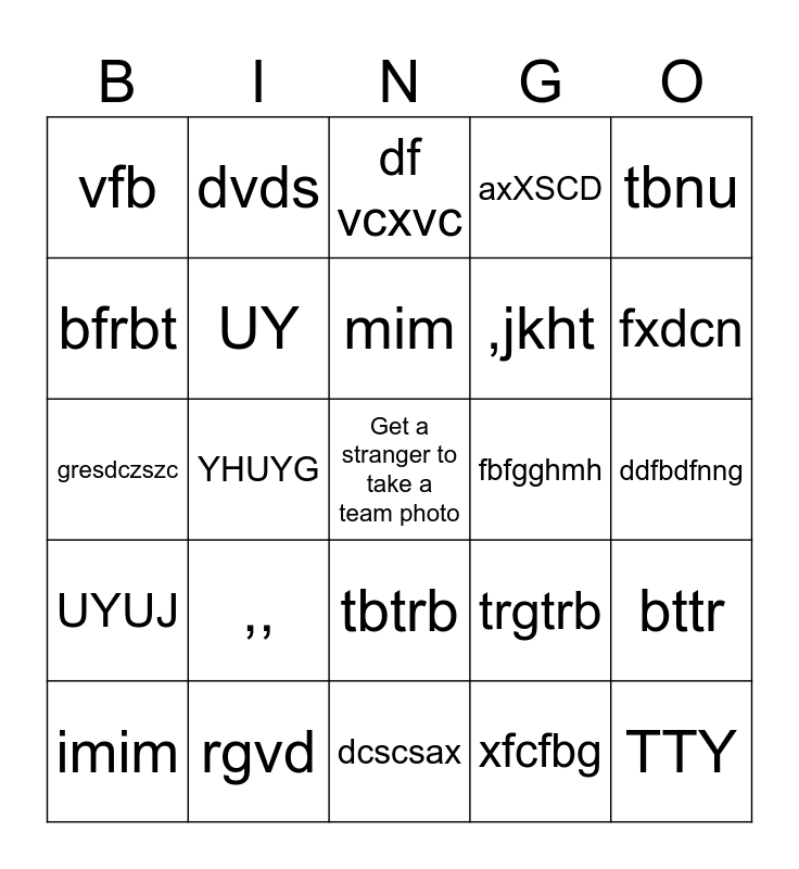 This bingo card has a free space and 24 words: ,,, rgvd, mim, imim, tbnu, vfb, bfrbt, dvds, fbfgghmh, tbtrb, ,jkht, gresdczszc, trgtrb, bttr, UY, xfcfbg, ddfbdfnng, df vcxvc, fxdcn, YHUYG, TTY, UYUJ, axXSCD and dcscsax.