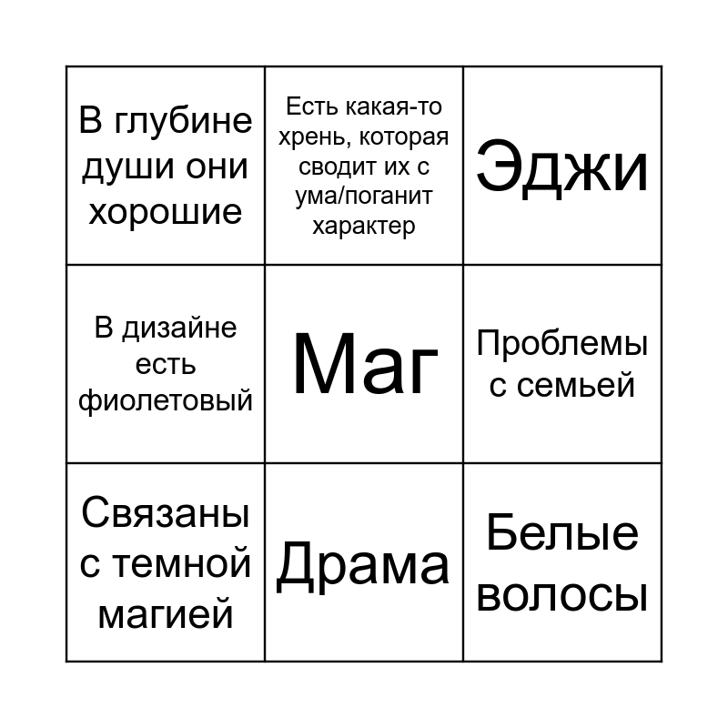 This bingo card has a free space and 8 words: Проблемы с семьей, Эджи, Есть какая-то хрень, которая сводит их с ума/поганит характер, Связаны с темной магией, В глубине души они хорошие, Белые волосы, В дизайне есть фиолетовый and Драма.