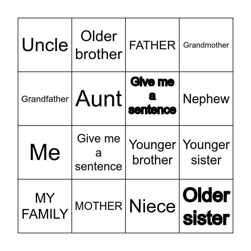 This bingo card has 16 words: MY FAMILY, MOTHER, FATHER, Grandmother, Grandfather, Older brother, Younger brother, Younger sister, Uncle, Aunt, Niece, Nephew, Me, Give me a sentence, Give me a sentence and Older sister.