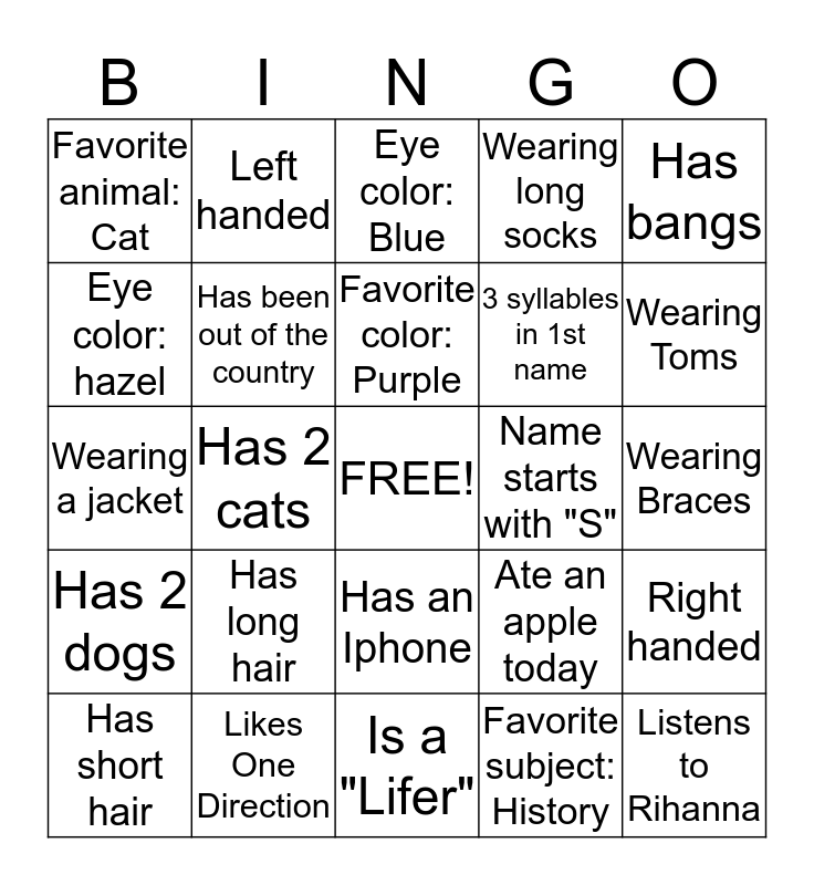 This bingo card has a free space and 24 words: Has long hair, Likes One Direction, Favorite color: Purple, Has short hair, Has bangs, Favorite animal: Cat, Eye color: hazel, Left handed, Name starts with "S", Has an Iphone, 3 syllables in 1st name, Wearing a jacket, Ate an apple today, Right handed, Has been out of the country, Favorite subject: History, Wearing Braces, Eye color: Blue, Wearing Toms, Has 2 cats, Listens to Rihanna, Has 2 dogs, Wearing long socks and Is a "Lifer".