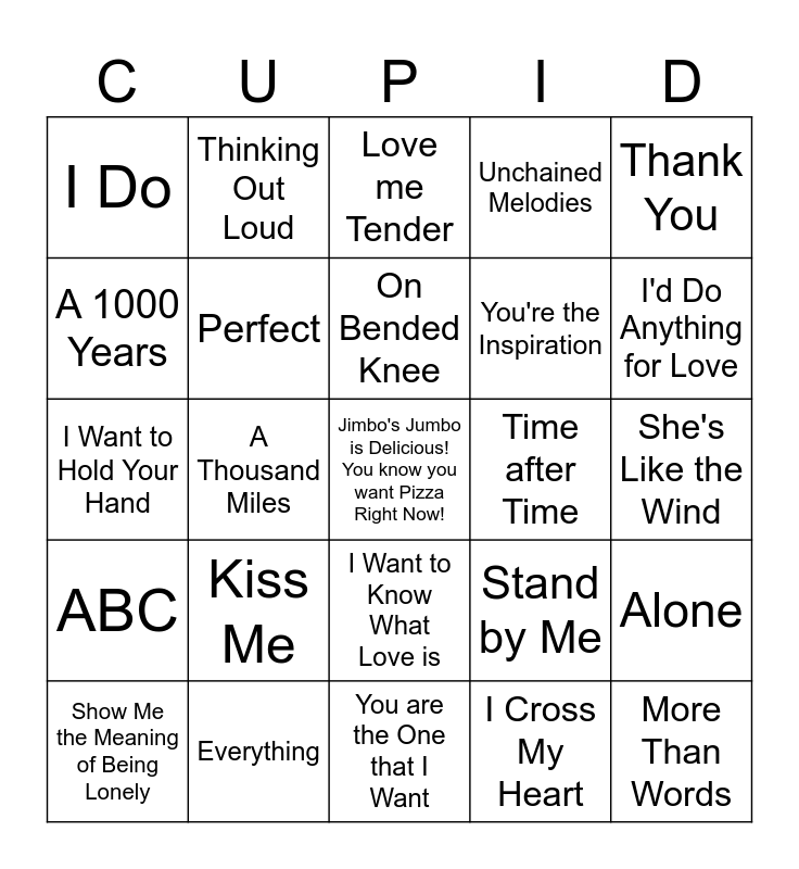 This bingo card has a free space and 76 words: Lost in Love, Mandy, Love me Tender, Hello Darlin', Islands in the Stream, Lady, Right Here Waiting, Ever the Same, Heaven, Love of a Lifetime, Always, Iris, On Bended Knee, A 1000 Years, All of Me, A Thousand Miles, Truly Madly Deeply, More Than Words, I Swear, Thank You, Nothing's Gonna Stop Us, I Want to Hold Your Hand, Perfect, Thinking Out Loud, Unchained Melodies, Hello, Everything I do, The Power of Love, At Last, My Girl, Be My Baby, Moon River, Strangers in the Night, Stand by Me, I'd Do Anything for Love, You're the Inspiration, Angel Eyes, Hungry Eyes, She's Like the Wind, I Cross My Heart, Kiss on My List, How Do I Live, I Will Always Love You, Endless Love, When I See You Smile, Don't Know Much, Show Me the Meaning of Being Lonely, I Do, My Immortal, Crimson and Clover, Angel, I Want to Know What Love is, I'll Stand by You, Glory of Love, It Must Have Been Love, Faithfully, Can't Fight this Feeling, Crazy for You, Nothing Compares to You, Take on Me, Kiss Me, Eternal Flame, The Lady in Red, In Your Eyes, Crash into Me, Wicked Game, Time after Time, Take My Breathe Away, Time of My Life, Have I Told You Lately, Alone, ABC, Everything, Purple Rain, You are the One that I Want and Possession.