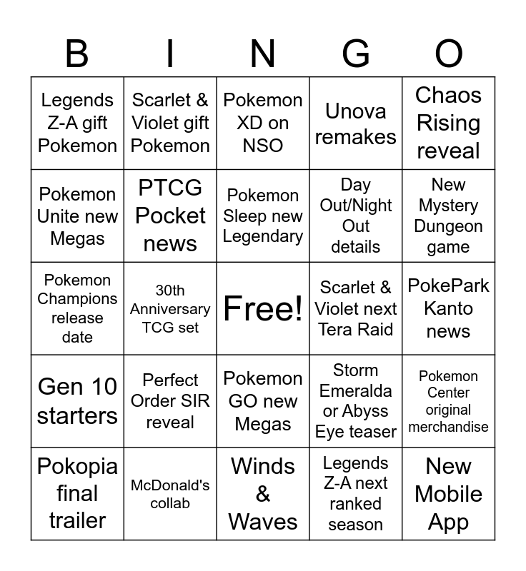 This bingo card has a free space and 24 words: Perfect Order SIR reveal, McDonald's collab, Pokemon Sleep new Legendary, Pokopia final trailer, Chaos Rising reveal, Legends Z-A gift Pokemon, Pokemon Unite new Megas, Scarlet & Violet gift Pokemon, Scarlet & Violet next Tera Raid, Pokemon GO new Megas, Day Out/Night Out details, Pokemon Champions release date, Storm Emeralda or Abyss Eye teaser, Pokemon Center original merchandise, PTCG Pocket news, Legends Z-A next ranked season, PokePark Kanto news, Pokemon XD on NSO, New Mystery Dungeon game, 30th Anniversary TCG set, New Mobile App, Gen 10 starters, Unova remakes and Winds & Waves.