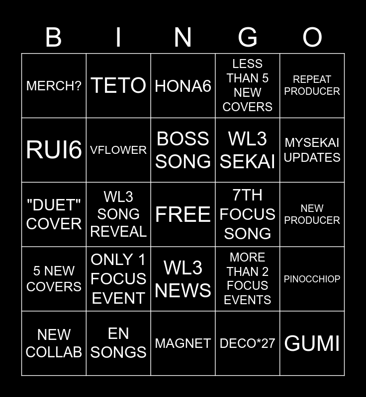 This bingo card has a free space and 24 words: ONLY 1 FOCUS EVENT, EN SONGS, BOSS SONG, NEW COLLAB, REPEAT PRODUCER, MERCH?, RUI6, TETO, 7TH FOCUS SONG, WL3 NEWS, WL3 SEKAI, "DUET" COVER, MORE THAN 2 FOCUS EVENTS, PINOCCHIOP, VFLOWER, DECO*27, NEW PRODUCER, HONA6, MYSEKAI UPDATES, WL3 SONG REVEAL, GUMI, 5 NEW COVERS, LESS THAN 5 NEW COVERS and MAGNET.