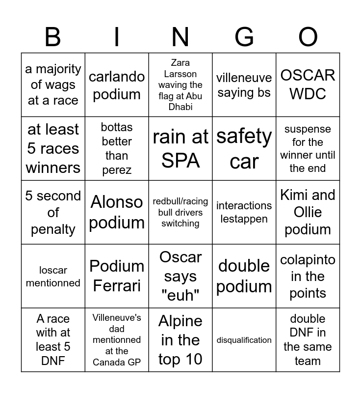 This bingo card has 25 words: Podium Ferrari, Alpine in the top 10, rain at SPA, A race with at least 5 DNF, OSCAR WDC, a majority of wags at a race, at least 5 races winners, carlando podium, interactions lestappen, Oscar says "euh", safety car, 5 second of penalty, double podium, colapinto in the points, bottas better than perez, double DNF in the same team, Kimi and Ollie podium, Zara Larsson waving the flag at Abu Dhabi, suspense for the winner until the end, Alonso podium, redbull/racing bull drivers switching, Villeneuve's dad mentionned at the Canada GP, loscar mentionned, villeneuve saying bs and disqualification.