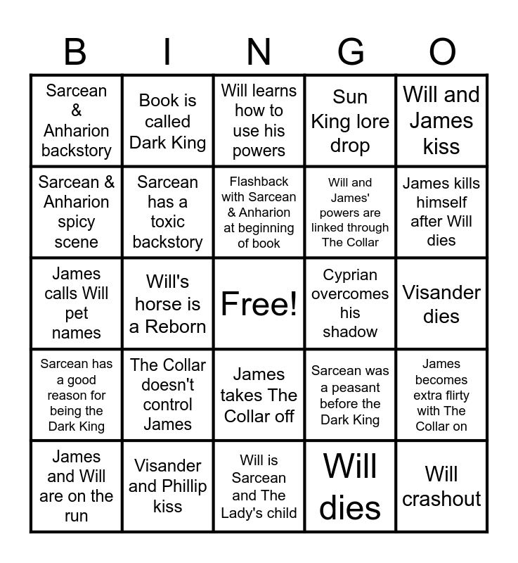 This bingo card has a free space and 24 words: The Collar doesn't control James, Visander and Phillip kiss, Flashback with Sarcean & Anharion at beginning of book, James and Will are on the run, Will and James kiss, Sarcean & Anharion backstory, Sarcean & Anharion spicy scene, Book is called Dark King, Cyprian overcomes his shadow, James takes The Collar off, Will and James' powers are linked through The Collar, James calls Will pet names, Sarcean was a peasant before the Dark King, James becomes extra flirty with The Collar on, Sarcean has a toxic backstory, Will dies, Visander dies, Will learns how to use his powers, James kills himself after Will dies, Will's horse is a Reborn, Will crashout, Sarcean has a good reason for being the Dark King, Sun King lore drop and Will is Sarcean and The Lady's child.