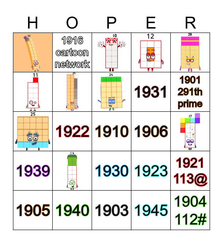 This bingo card has 30 images and 48 words: 1901 291th prime, 1902, 1903, 1904 112#, 1905, 1906, 1907 292th prime, 1908, 1909 23x83, 1910, 1911, 1912, 1913 293th 62th Prime, 1914 174th fooball, 1915, 1916 cartoon network, 1917, 1918, 1919, 1920, 1921 113@, 1922, 1923, 1924, 1925, 1926, 1927, 1928, 1929, 1930, 1931, 1932, 1933, 1934, 1935, 1936, 1937, 1938 114, 1939, 1940, 1941, 1942, 1943, 1944, 1945, Red, Blue and Yellow.