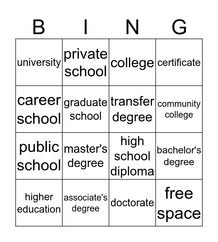This bingo card has 16 words: associate's degree, bachelor's degree, college, university, public school, private school, high school diploma, doctorate, career school, graduate school, higher education, certificate, master's degree, community college, transfer degree and free space.
