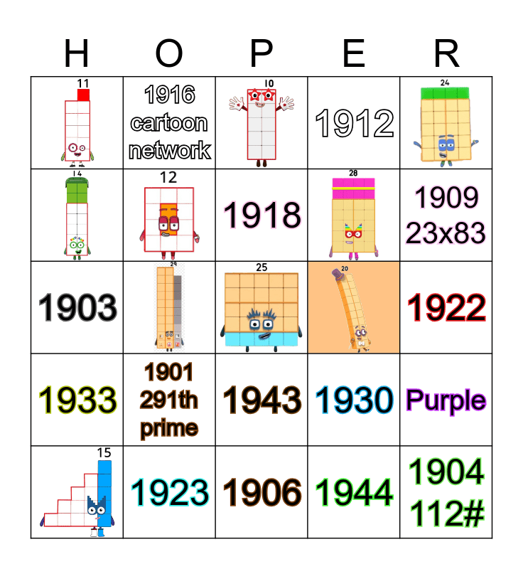 This bingo card has 30 images and 52 words: 1901 291th prime, 1902, 1903, 1904 112#, 1905, 1906, 1907 292th prime, 1908, 1909 23x83, 1910, 1911, 1912, 1913 293th 62th Prime, 1914 174th fooball, 1915, 1916 cartoon network, 1917, 1918, 1919, 1920, 1921 113@, 1922, 1923, 1924, 1925, 1926, 1927, 1928, 1929, 1930, 1931, 1932, 1933, 1934, 1935, 1936, 1937, 1938 114, 1939, 1940, 1941, 1942, 1943, 1944, 1945, Red, Blue, Yellow, Green, Orange, Purple and Rainbow.