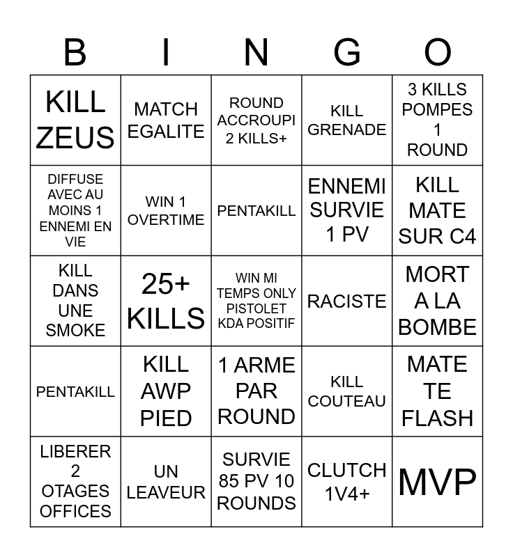 This bingo card has a free space and 24 words: KILL AWP PIED, UN LEAVEUR, PENTAKILL, LIBERER 2 OTAGES OFFICES, 3 KILLS POMPES 1 ROUND, KILL ZEUS, DIFFUSE AVEC AU MOINS 1 ENNEMI EN VIE, MATCH EGALITE, RACISTE, 1 ARME PAR ROUND, ENNEMI SURVIE 1 PV, KILL DANS UNE SMOKE, KILL COUTEAU, MATE TE FLASH, WIN 1 OVERTIME, CLUTCH 1V4+, MORT A LA BOMBE, ROUND ACCROUPI 2 KILLS+, KILL MATE SUR C4, 25+ KILLS, MVP, PENTAKILL, KILL GRENADE and SURVIE 85 PV 10 ROUNDS.
