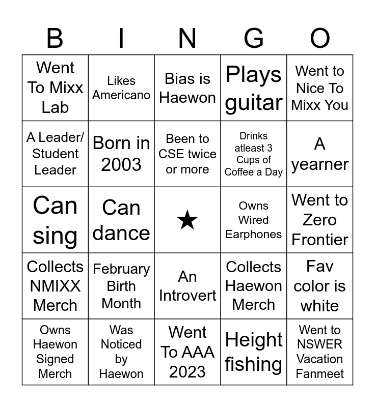 This bingo card has a free space and 24 words: February Birth Month, Was Noticed by Haewon, Been to CSE twice or more, Owns Haewon Signed Merch, Went to Nice To Mixx You, Went To Mixx Lab, A Leader/ Student Leader, Likes Americano, Owns Wired Earphones, An Introvert, Drinks atleast 3 Cups of Coffee a Day, Can sing, Collects Haewon Merch, Fav color is white, Born in 2003, Height fishing, Went to Zero Frontier, Bias is Haewon, A yearner, Can dance, Went to NSWER Vacation Fanmeet, Collects NMIXX Merch, Plays guitar and Went To AAA 2023.