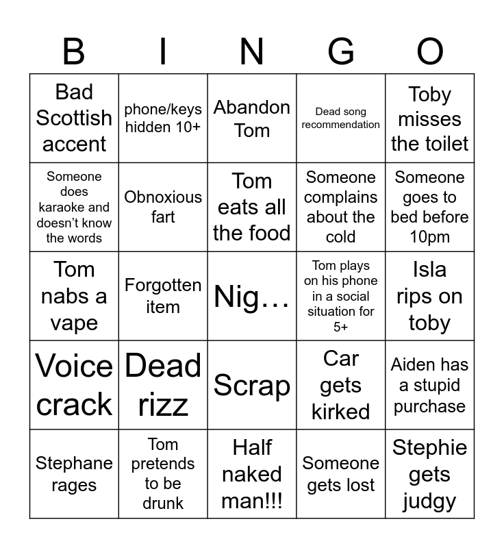 This bingo card has a free space and 24 words: Stephane rages, Dead rizz, Tom eats all the food, Someone gets lost, Toby misses the toilet, Bad Scottish accent, phone/keys hidden 10+, Abandon Tom, Tom plays on his phone in a social situation for 5+, Isla rips on toby, Tom nabs a vape, Obnoxious fart, Car gets kirked, Aiden has a stupid purchase, Someone does karaoke and doesn’t know the words, Tom pretends to be drunk, Half naked man!!!, Dead song recommendation, Someone goes to bed before 10pm, Voice crack, Forgotten item, Scrap, Someone complains about the cold and Stephie gets judgy.