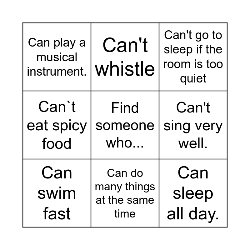 This bingo card has a free space and 8 words: Can't sing very well., Can't go to sleep if the room is too quiet, Can't whistle, Can swim fast, Can play a musical instrument., Can sleep all day., Can`t eat spicy food and Can do many things at the same time.