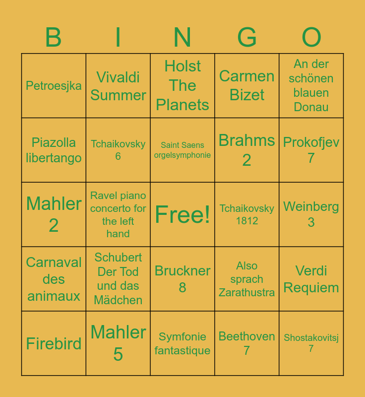 This bingo card has a free space and 42 words: Mozart Requiem, Saint Saens orgelsymphonie, Brandenburg Concerto no. 6, Schubert Der Tod und das Mädchen, Beethoven 7, Verdi Requiem, Shostakovitsj 7, Dvorak 9, Holst The Planets, Bruckner 8, Weinberg 3, Prokofjev 7, Ravel piano concerto for the left hand, An der schönen blauen Donau, Rachmaninov pianoconcerto no.2, Also sprach Zarathustra, Pictures at an exhibition, Mahler 2, Sacre du printemps, Vivaldi Summer, Piazolla libertango, Danzon no 2, La mer, Petroesjka, Elgar cello concert, Barber of seville, Brahms 2, Alpensymfonie, Tombeau de couperin, Nutcracker, Prokofiev 2e violin concerto, Carnaval des animaux, Tchaikovsky 6, Symfonie fantastique, Tchaikovsky violin concerto, Firebird, Mahler 5, Tchaikovsky 1812, Ravel Daphnis et Chloe, Don't stop me now, Carmen Bizet and Mattheüs Passion.