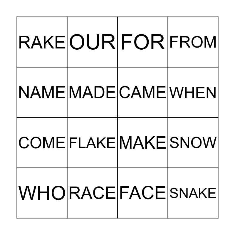 This bingo card has 16 words: RACE, SNOW, FOR, RAKE, COME, OUR, MAKE, FACE, NAME, MADE, WHO, FROM, FLAKE, WHEN, CAME and SNAKE.