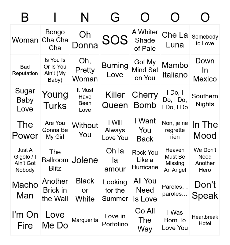 This bingo card has 49 words: Paroles… paroles…, Mambo Italiano, Go All The Way, Are You Gonna Be My Girl, It Must Have Been Love, In The Mood, Bongo Cha Cha Cha, Marguerita, Che La Luna, Oh la la amour, Somebody to Love, SOS, I Do, I Do, I Do, I Do, I Do, Cherry Bomb, Another Brick in the Wall, Non, je ne regrette rien, Bad Reputation, Down In Mexico, Don't Speak, A Whiter Shade of Pale, Got My Mind Set on You, Without You, Woman, Is You Is Or Is You Ain't (My Baby), I'm On Fire, Oh, Pretty Woman, Southern Nights, Love Me Do, Killer Queen, Young Turks, Heartbreak Hotel, I Want You Back, Macho Man, Black or White, The Power, Rock You Like a Hurricane, Heaven Must Be Missing An Angel, We Don't Need Another Hero, Sugar Baby Love, Jolene, Looking for the Summer, Just A Gigolo / I Ain't Got Nobody, I Will Always Love You, Love in Portofino, Burning Love, Oh Donna, All You Need Is Love, The Ballroom Blitz and I Was Born To Love You.