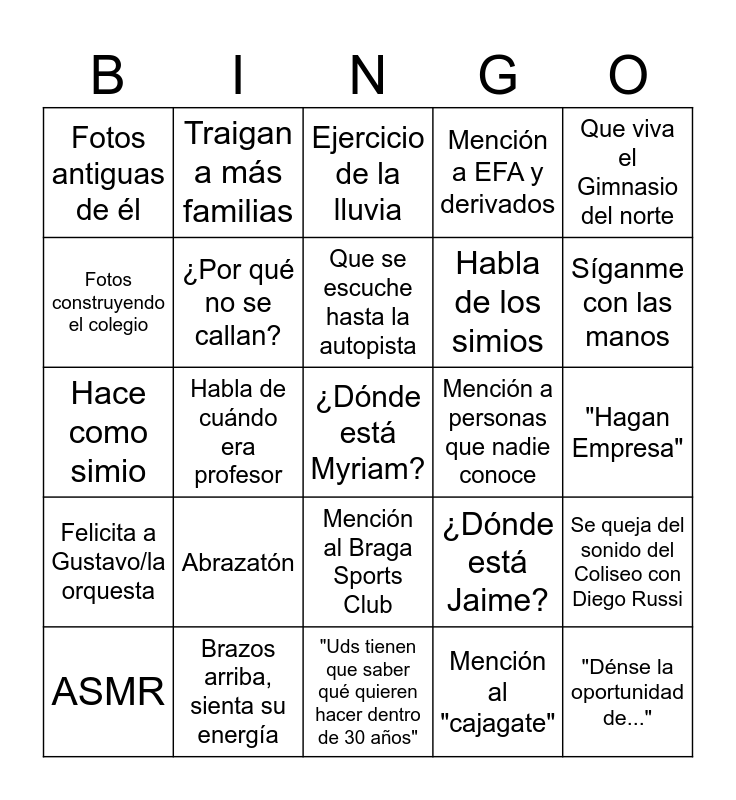 This bingo card has a free space and 24 words: Abrazatón, Brazos arriba, sienta su energía, Que se escuche hasta la autopista, ASMR, Que viva el Gimnasio del norte, Fotos antiguas de él, Fotos construyendo el colegio, Traigan a más familias, Mención a personas que nadie conoce, Mención al Braga Sports Club, Habla de los simios, Hace como simio, ¿Dónde está Jaime?, Se queja del sonido del Coliseo con Diego Russi, ¿Por qué no se callan?, Mención al "cajagate", "Hagan Empresa", Ejercicio de la lluvia, Síganme con las manos, Habla de cuándo era profesor, "Dénse la oportunidad de...", Felicita a Gustavo/la orquesta, Mención a EFA y derivados and "Uds tienen que saber qué quieren hacer dentro de 30 años".