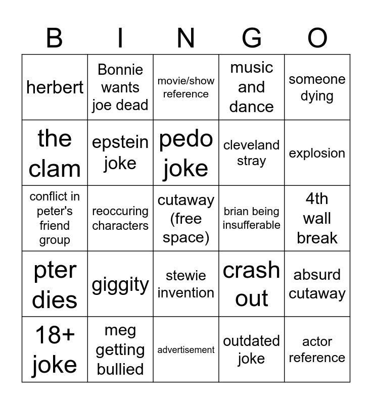 This bingo card has a free space and 24 words: giggity, meg getting bullied, pedo joke, 18+ joke, someone dying, herbert, the clam, Bonnie wants joe dead, brian being insufferable, stewie invention, cleveland stray, conflict in peter's friend group, crash out, absurd cutaway, epstein joke, outdated joke, 4th wall break, movie/show reference, explosion, reoccuring characters, actor reference, pter dies, music and dance and advertisement.