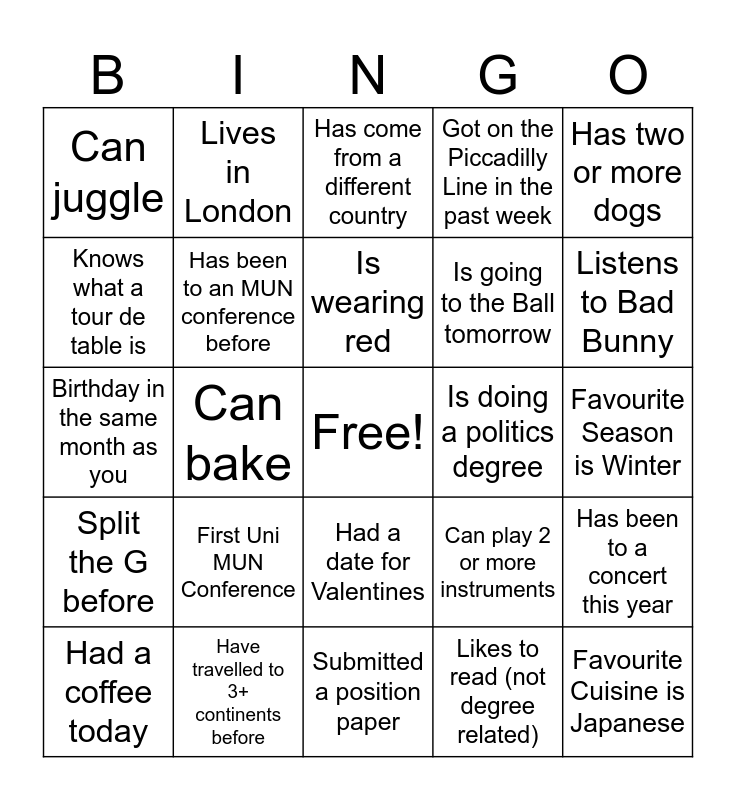 This bingo card has a free space and 24 words: First Uni MUN Conference, Have travelled to 3+ continents before, Is wearing red, Had a coffee today, Has two or more dogs, Can juggle, Knows what a tour de table is, Lives in London, Is doing a politics degree, Had a date for Valentines, Is going to the Ball tomorrow, Birthday in the same month as you, Can play 2 or more instruments, Has been to a concert this year, Has been to an MUN conference before, Likes to read (not degree related), Favourite Season is Winter, Has come from a different country, Listens to Bad Bunny, Can bake, Favourite Cuisine is Japanese, Split the G before, Got on the Piccadilly Line in the past week and Submitted a position paper.