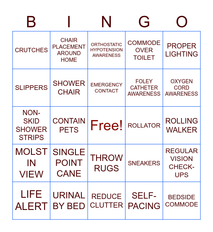 This bingo card has a free space and 39 words: CHECK DOORWAYS, GRAB BARS, TUB BENCH, SHOWER CHAIR, LIFE ALERT, THROW RUGS, EMERGENCY CONTACT, PHONE IN REACH, PROPER LIGHTING, MOLST IN VIEW, CONTAIN PETS, COMMODE OVER TOILET, BEDSIDE COMMODE, ROLLING WALKER, ROLLATOR, SINGLE POINT CANE, QUAD CANE, CRUTCHES, GRIPPED SOCKS, SNEAKERS, SLIPPERS, REDUCE CLUTTER, FOLEY CATHETER AWARENESS, OXYGEN CORD AWARENESS, BED RAILS, MEDICATION MANAGEMENT PLAN, SOCK AIDE, REACHER, DRESSING STICK, CHAIR PLACEMENT AROUND HOME, STANDARD WHEELCHAIR, TRANSPORT WHEELCHAIR, ORTHOSTATIC HYPOTENSION AWARENESS, URINAL BY BED, SELF-PACING, WHEELCHAIR /ROLLATOR BRAKES, REGULAR VISION CHECK-UPS, NON-SKID SHOWER STRIPS and REGULAR MEDICATION REVIEW.