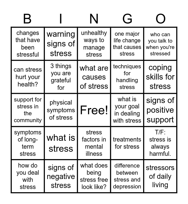 This bingo card has a free space and 24 words: what is stress, signs of negative stress, what are causes of stress, how do you deal with stress, who can you talk to when you're stressed, changes that have been stressful, can stress hurt your health?, warning signs of stress, what is your goal in dealing with stress, stress factors in mental illness, techniques for handling stress, support for stress in the community, treatments for stress, T/F: stress is always harmful., 3 things you are grateful for, difference between stress and depression, signs of positive support, unhealthy ways to manage stress, coping skills for stress, physical symptoms of stress, stressors of daily living, symptoms of long-term stress, one major life change that causes stress and what does being stress free look like?.