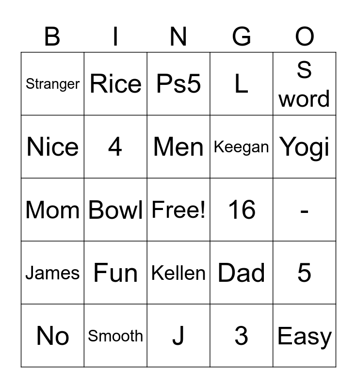 This bingo card has a free space and 24 words: Fun, Smooth, Men, No, S word, Stranger, Nice, Rice, 16, Kellen, Keegan, Mom, Dad, 5, 4, 3, -, Ps5, Yogi, Bowl, Easy, James, L and J.