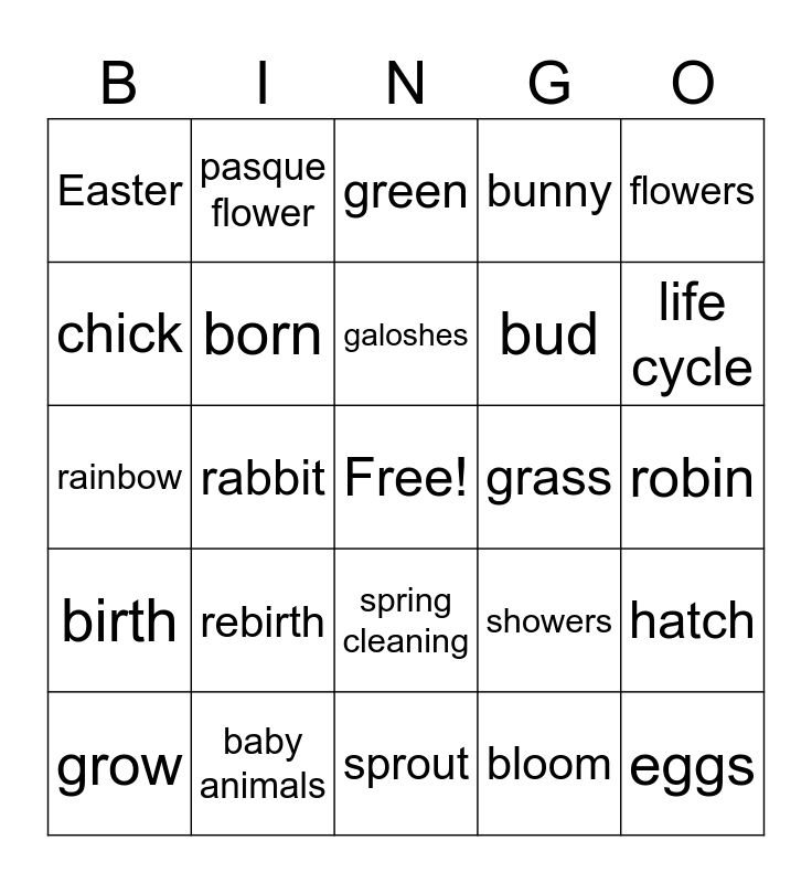 This bingo card has a free space and 61 words: April, baby animals, baseball, birth, bloom, blossom, born, breeze, bud, bulbs, bunny, butterfly, chick, crocus, daffodil, Easter, eggs, flowers, foal, galoshes, grass, green, grow, hatch, hyacinth, June, kid (baby goat), lamb, life cycle, March, May, melt, narcissus, nest, pasque flower, polliwog, puddles, rabbit, rain, rainbow, raincoat, rebirth, robin, season, showers, slicker, snowdrop, spring, spring break, spring cleaning, sprout, sunshine, tadpole, thaw, tulip, umbrella, vernal equinox, warming, weather, windy and worm.