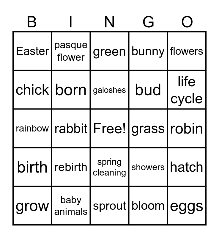 This bingo card has a free space and 61 words: April, baby animals, baseball, birth, bloom, blossom, born, breeze, bud, bulbs, bunny, butterfly, chick, crocus, daffodil, Easter, eggs, flowers, foal, galoshes, grass, green, grow, hatch, hyacinth, June, kid (baby goat), lamb, life cycle, March, May, melt, narcissus, nest, pasque flower, polliwog, puddles, rabbit, rain, rainbow, raincoat, rebirth, robin, season, showers, slicker, snowdrop, spring, spring break, spring cleaning, sprout, sunshine, tadpole, thaw, tulip, umbrella, vernal equinox, warming, weather, windy and worm.