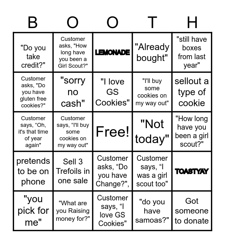 This bingo card has a free space and 58 words: THIN MINT, "What are you Raising money for?", "My kid is selling too", pretends to be on phone, "do you have samoas?", "I am on a diet", "sorry no cash", CARMEL DELIGHT, "I'll buy some cookies on my way out", "Oh, it's that time of year again", "Already bought", TREFOIL, "My favorite season", "I was a girl scout too", "Where do donations go?", "Do you take credit?", Got someone to donate, "still have boxes from last year", "Do you have Change?", "I love GS Cookies", "Not today", LEMONADE, "you pick for me", TOASTYAY, "do you have shortbread cookies?", "How long have you been a girl scout?", "I can"t eat cookies", "Do you have gluten free cookies?", sellout a type of cookie, Sell 4 Thin Mints in one sale, Tell a customer what you are raising money for, Customer says, "My kid is selling too", Customer pretends to be on phone, Customer asks, “Do you have samosa?", Customer says, "I am on a diet", Customer says, “Sorry I don’t have cash", Sell 6 Caramel deLites in one sale, Customer says, “I'll buy some cookies on my way out", Customer says, “Oh, it's that time of year again", Customer says, "I already bought some", Sell 3 Trefoils in one sale, Customer says, “My favorite season", Customer says, “I was a girl scout too", Customer asks, "Where do donations go?", Customer asks, “Do you take cards?", Customer donates a box, Customer says, “I still have boxes from last year”, Customer asks, “Do you have Change?",, Customer says, “I love GS Cookies", Customer says, “Not today", Sell two Lemonades in one sale, Customer says, “You pick for me", Sell five Exploremores in one sale, Customer asks, “Do you have shortbread cookies?", Customer asks, "How long have you been a Girl Scout?", Customer says, "I can’t eat cookies", Customer asks, "Do you have gluten free cookies?" and Sell a type of cookie..