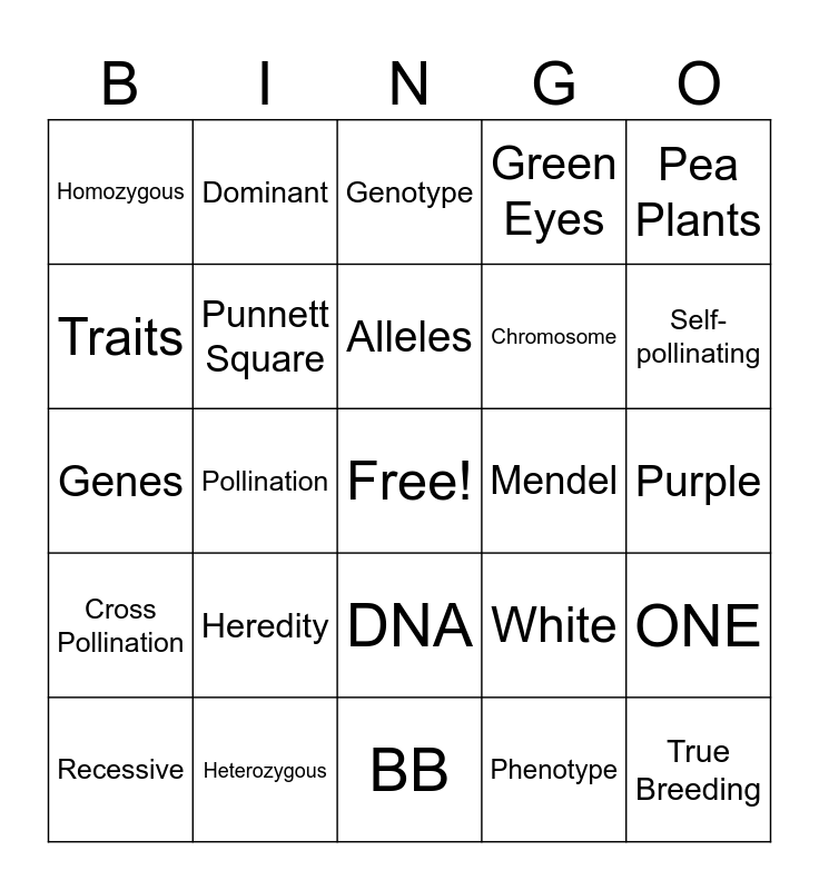 This bingo card has a free space and 24 words: Heredity, Heterozygous, Alleles, Recessive, Pea Plants, Homozygous, Traits, Dominant, Mendel, DNA, Chromosome, Genes, White, ONE, Punnett Square, Phenotype, Purple, Genotype, Self-pollinating, Pollination, True Breeding, Cross Pollination, Green Eyes and BB.