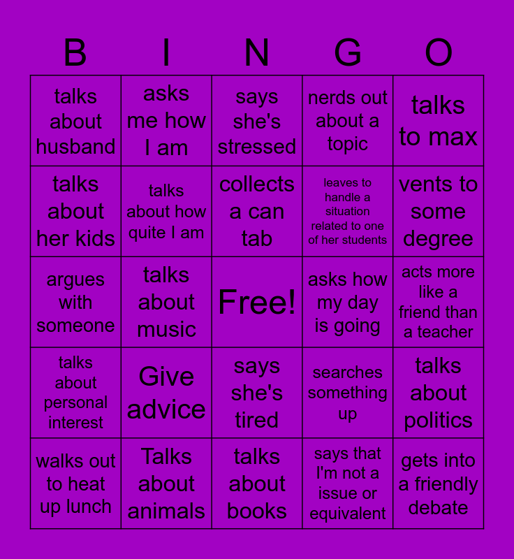 This bingo card has a free space and 24 words: Give advice, Talks about animals, collects a can tab, walks out to heat up lunch, talks to max, talks about husband, talks about her kids, asks me how I am, asks how my day is going, says she's tired, leaves to handle a situation related to one of her students, argues with someone, searches something up, talks about politics, talks about how quite I am, says that I'm not a issue or equivalent, acts more like a friend than a teacher, says she's stressed, vents to some degree, talks about music, gets into a friendly debate, talks about personal interest, nerds out about a topic and talks about books.