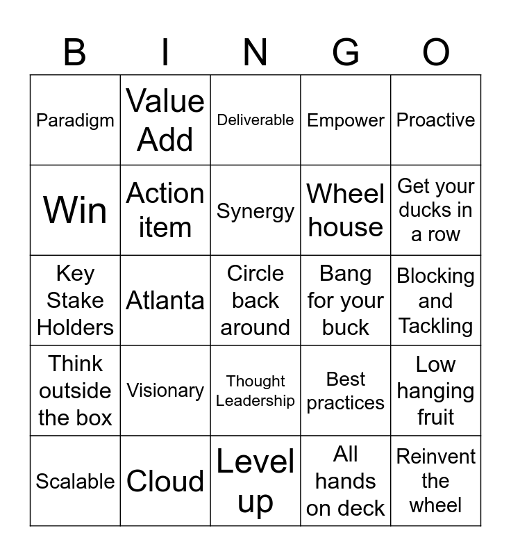 This bingo card has 30 words: Scalable, KPI, Synergy, R.O.I., Proactive, Paradigm, Value Add, Thought Leadership, Bang for your buck, Reinvent the wheel, Think outside the box, Action item, Free!, All hands on deck, Low hanging fruit, On the same page, Atlanta, Circle back around, Best practices, Get your ducks in a row, Key Stake Holders, Cloud, Deliverable, Wheel house, Blocking and Tackling, Win, Visionary, Level up, Empower and Forward thinking.
