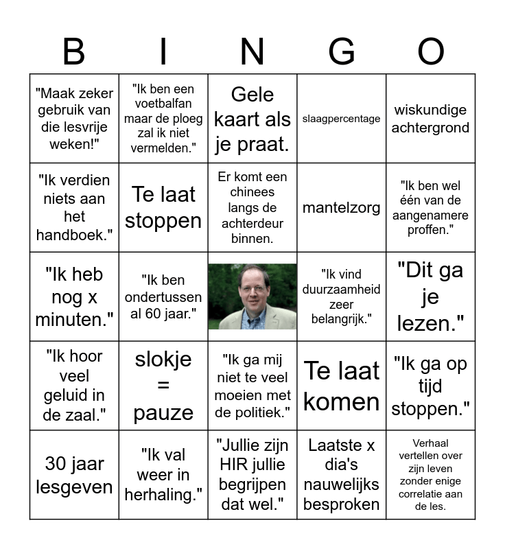This bingo card has a free space and 24 words: slokje = pauze, "Ik val weer in herhaling.", Er komt een chinees langs de achterdeur binnen., 30 jaar lesgeven, wiskundige achtergrond, "Maak zeker gebruik van die lesvrije weken!", "Ik verdien niets aan het handboek.", "Ik ben een voetbalfan maar de ploeg zal ik niet vermelden.", "Ik vind duurzaamheid zeer belangrijk.", "Ik ga mij niet te veel moeien met de politiek.", mantelzorg, "Ik heb nog x minuten.", Te laat komen, "Ik ga op tijd stoppen.", Te laat stoppen, Laatste x dia's nauwelijks besproken, "Dit ga je lezen.", Gele kaart als je praat., "Ik ben wel één van de aangenamere proffen.", "Ik ben ondertussen al 60 jaar.", Verhaal vertellen over zijn leven zonder enige correlatie aan de les., "Ik hoor veel geluid in de zaal.", slaagpercentage and "Jullie zijn HIR jullie begrijpen dat wel.".