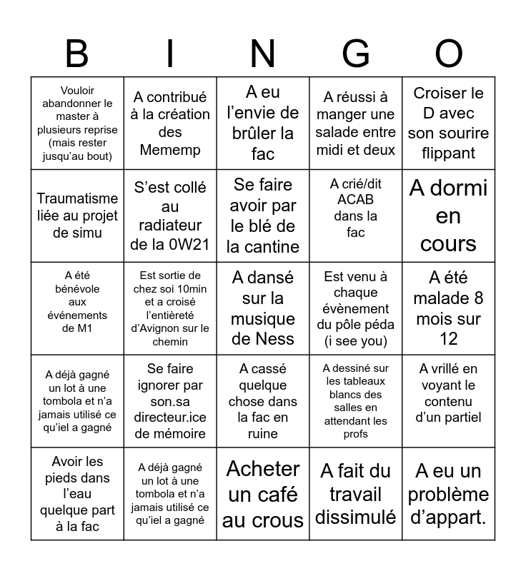This bingo card has 25 words: Se faire ignorer par son.sa directeur.ice de mémoire, Acheter un café au crous, Se faire avoir par le blé de la cantine, Avoir les pieds dans l’eau quelque part à la fac, Croiser le D avec son sourire flippant, Vouloir abandonner le master à plusieurs reprise (mais rester jusqu’au bout), Traumatisme liée au projet de simu, A contribué à la création des Mememp, Est venu à chaque évènement du pôle péda (i see you), A cassé quelque chose dans la fac en ruine, A crié/dit ACAB dans la fac, A été bénévole aux événements de M1, A dessiné sur les tableaux blancs des salles en attendant les profs, A vrillé en voyant le contenu d’un partiel, S’est collé au radiateur de la 0W21, A eu un problème d’appart., A été malade 8 mois sur 12, A eu l’envie de brûler la fac, A dormi en cours, Est sortie de chez soi 10min et a croisé l’entièreté d’Avignon sur le chemin, A dansé sur la musique de Ness, A déjà gagné un lot à une tombola et n’a jamais utilisé ce qu’iel a gagné, A déjà gagné un lot à une tombola et n’a jamais utilisé ce qu’iel a gagné, A réussi à manger une salade entre midi et deux and A fait du travail dissimulé.