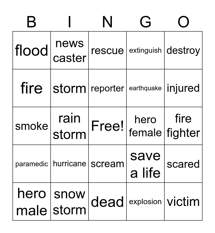 This bingo card has a free space and 24 words: hurricane, snow storm, reporter, hero male, destroy, flood, fire, news caster, hero female, scream, earthquake, smoke, save a life, scared, storm, explosion, fire fighter, rescue, injured, rain storm, victim, paramedic, extinguish and dead.