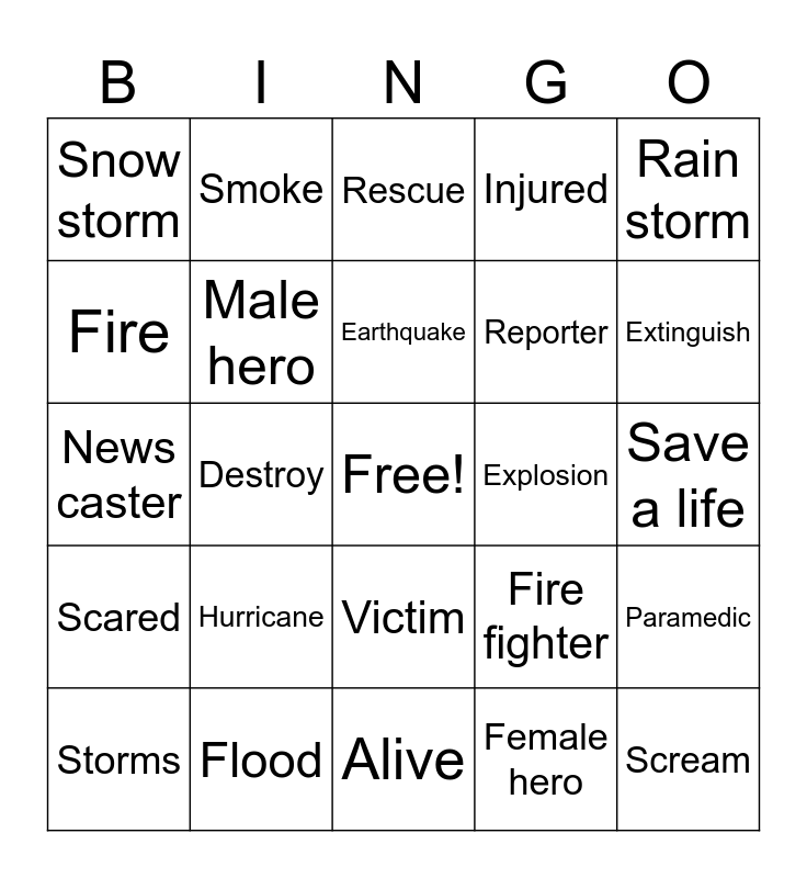 This bingo card has a free space and 24 words: Hurricane, Flood, Earthquake, Storms, Rain storm, Snow storm, Fire, Smoke, Explosion, Victim, Reporter, News caster, Fire fighter, Paramedic, Male hero, Female hero, Save a life, Rescue, Extinguish, Destroy, Scream, Scared, Injured and Alive.