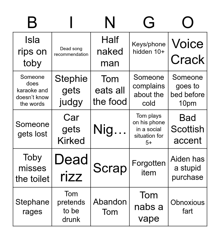 This bingo card has a free space and 24 words: Stephane rages, Dead rizz, Tom eats all the food, Tom nabs a vape, Voice Crack, Isla rips on toby, Dead song recommendation, Half naked man, Tom plays on his phone in a social situation for 5+, Bad Scottish accent, Someone gets lost, Stephie gets judgy, Forgotten item, Aiden has a stupid purchase, Someone does karaoke and doesn’t know the words, Tom pretends to be drunk, Abandon Tom, Keys/phone hidden 10+, Someone goes to bed before 10pm, Toby misses the toilet, Car gets Kirked, Scrap, Someone complains about the cold and Obnoxious fart.