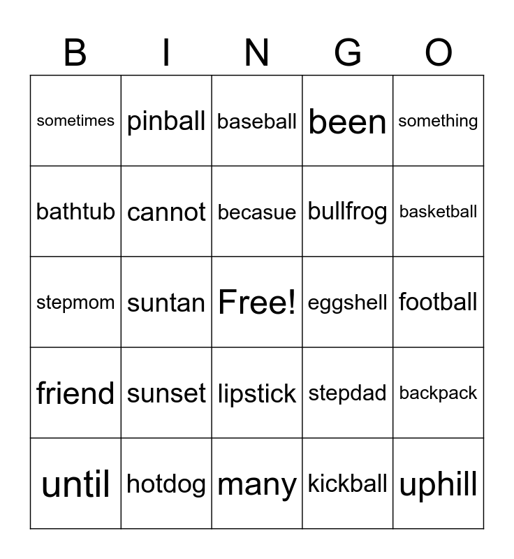 This bingo card has a free space and 24 words: sunset, hotdog, becasue, until, something, sometimes, bathtub, pinball, eggshell, lipstick, bullfrog, stepmom, stepdad, backpack, cannot, kickball, football, baseball, basketball, suntan, uphill, friend, been and many.