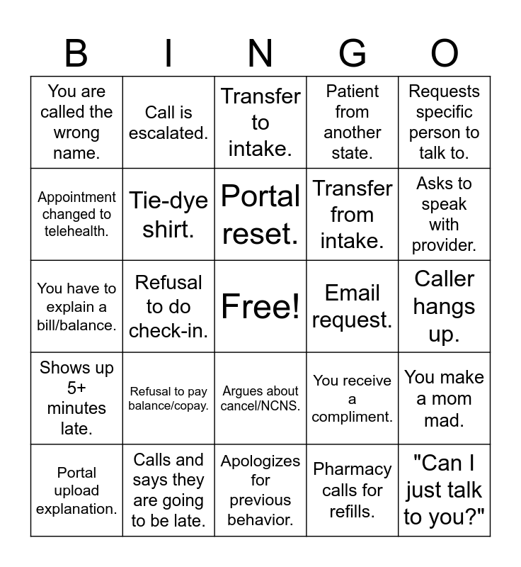 This bingo card has a free space and 24 words: Refusal to pay balance/copay., Calls and says they are going to be late., Portal reset., Portal upload explanation., Requests specific person to talk to., You are called the wrong name., Appointment changed to telehealth., Call is escalated., Email request., Argues about cancel/NCNS., Transfer from intake., You have to explain a bill/balance., You receive a compliment., You make a mom mad., Tie-dye shirt., Pharmacy calls for refills., Caller hangs up., Transfer to intake., Asks to speak with provider., Refusal to do check-in., "Can I just talk to you?", Shows up 5+ minutes late., Patient from another state. and Apologizes for previous behavior..